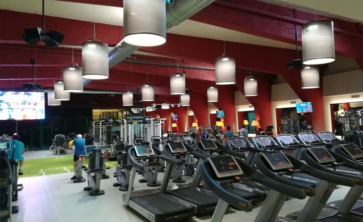 Para conseguir ahorro energético y bajar emisión de calor, substitución de proyectores de halogenuro 400W en la sala de fitness, por campanas Highbay LED HE Celer de 150W, manteniéndose las pantallas de tela preexistentes.