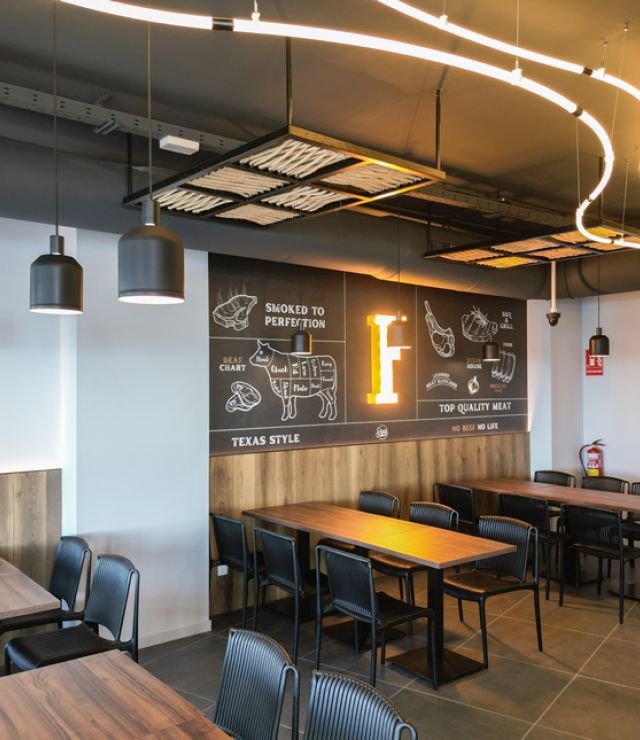 Buscando una atmósfera cálida y acogedora, se optó por iluminación colgante en tonos cálidos sobre las mesas y una gran luminaria lineal a medida que recorre el local con brazos entrecruzados. En zonas de trabajo, como barras, cocinas y baños, se emplearon paneles Next UGR<19 y downlights Alus IP44 de CELER, complementados con luminarias tubulares negras. La iluminación indirecta con tira LED cálida de CELER resalta rincones clave, incluyendo dos zonas diseñadas para fotos. En el exterior, una tira LED IP67 en la fachada y bajo la pérgola de la terraza refuerza el ambiente acogedor. Así, La Flama ofrece no solo una propuesta gastronómica única, sino también una experiencia donde la iluminación juega un papel clave.